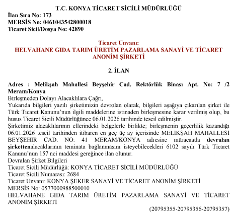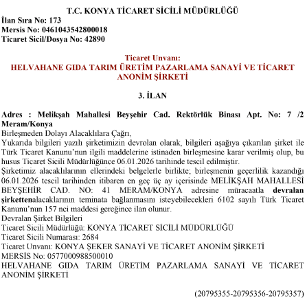 Helvahane Gıda Tarım Üretim Pazarlama Sanayi ve Ticaret A.Ş. Konya Şeker İle Birleşme İşlemi Hakkında |